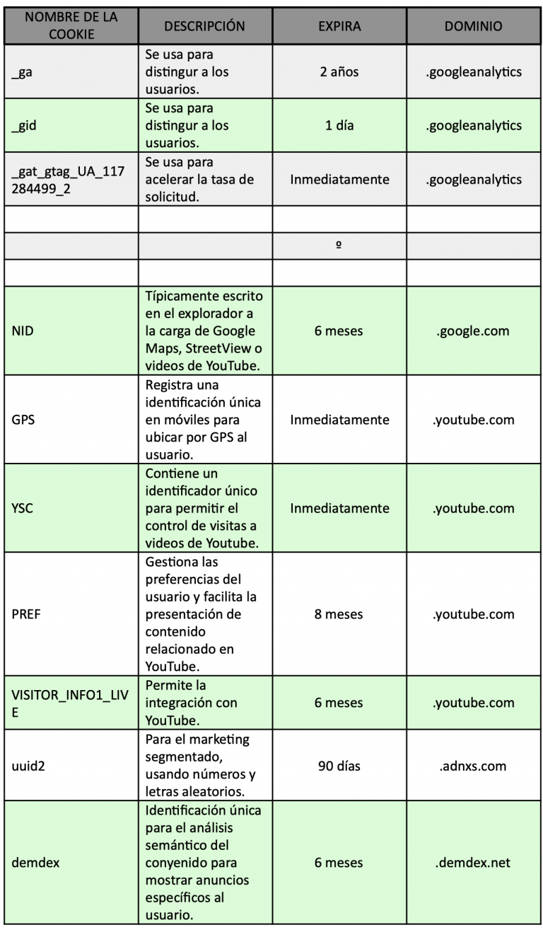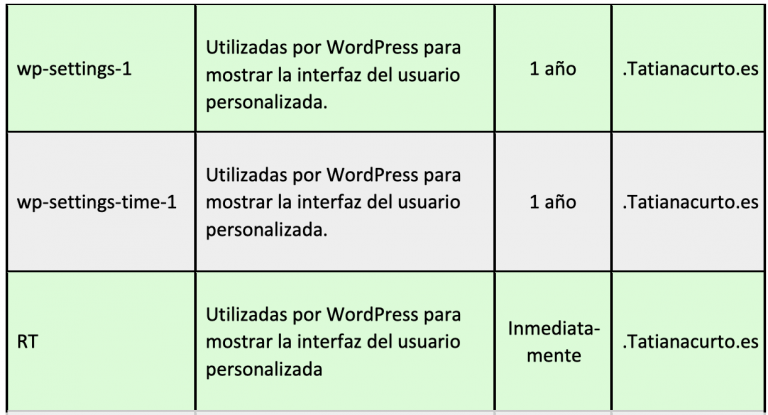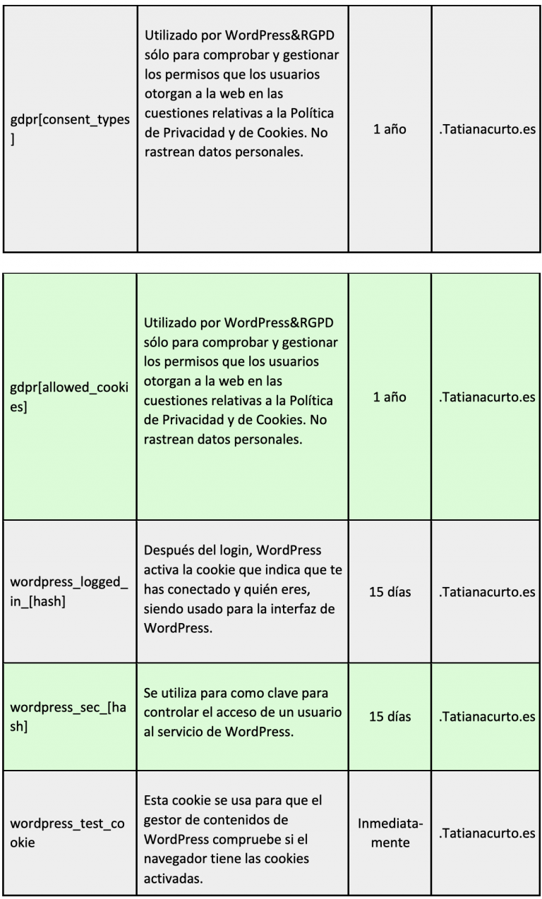 Las tablas de las cookies se irán actualizando según vaya usando más en la web, por nuevas funcionalidades de la misma. Bien es cierto, que en el momento de implantar esas nuevas funcionalidades, habrá un impás muy corto de tiempo en el que esas nuevas cookies no aparecerán en las tablas, hasta que no las tenga al día. En este sentido, agradezco tu comprensión. Última actualización 11/11/2018.
