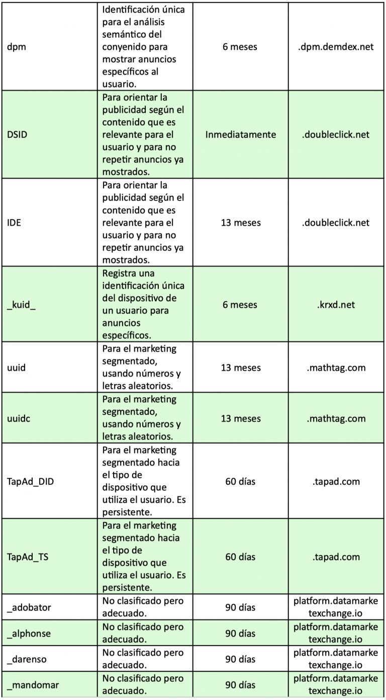 - Cookies publicitarias: Muestran publicidad en función de tu navegación, tu país de procedencia, idioma, etc.
